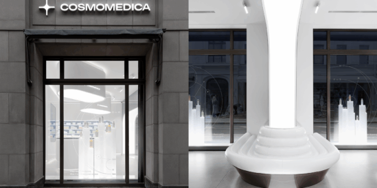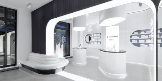 Идея бренда проникла и в оформление торгового пространства. В основе интерьерного дизайна — переосмысленный стиль Space Age: футуристическое направление 1960–70-х годов, вдохновлённое освоением космоса. Стиль отличают лёгкая вычурность, плавные, органические формы; обилие пластика, металла и стекла — в общем, всё должно выглядеть как детали интерьера орбитальной станции или жилища будущего.