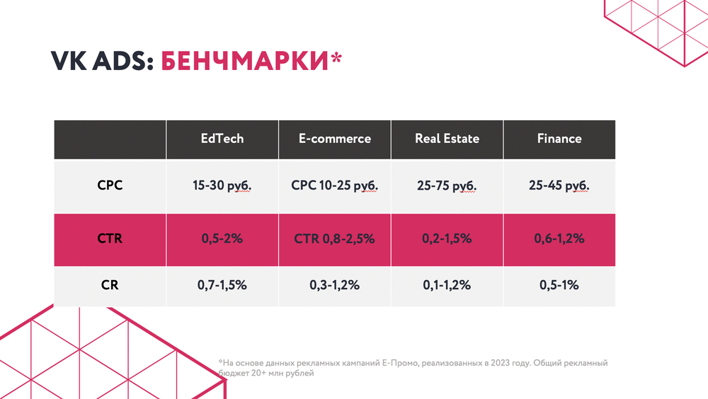 Больше шести месяцев с момента появления нового кабинета эксперты агентства E-Promo тестировали 100% доступного функционала, цели и тактики, а также те инструменты, которые открывает VK в режиме бета-теста. Данные представлены с учетом разных кампаний с суммарным бюджетом 20+ млн рублей. По итогу работы были выявлены бенчмарки по ключевым метрикам (CPC, CTR, CR) в разрезе четырех отраслей: E-commerce, EdTech, недвижимость, финансы.