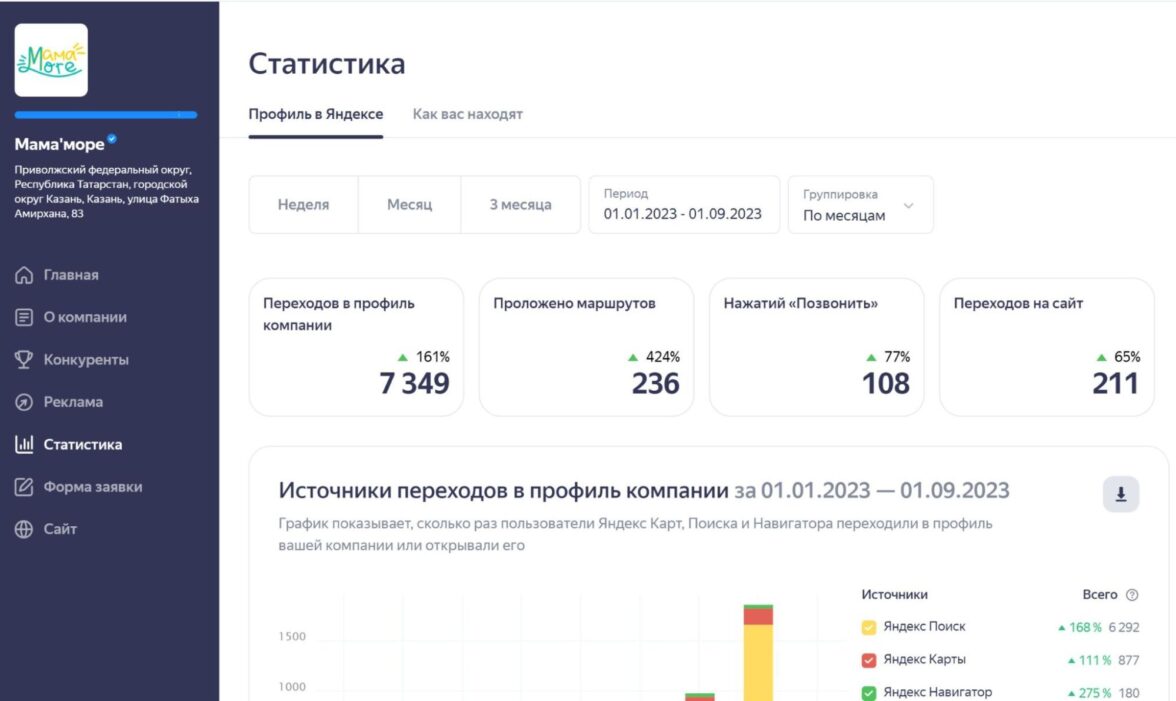 Благодаря грамотному заполнению карточки и системной работе с отзывами карточка детского центра Mama’more поднялась в выдаче в топ. Количество переходов на сайт увеличилось на 38%, количество кликов «позвонить» увеличилось на 40%.