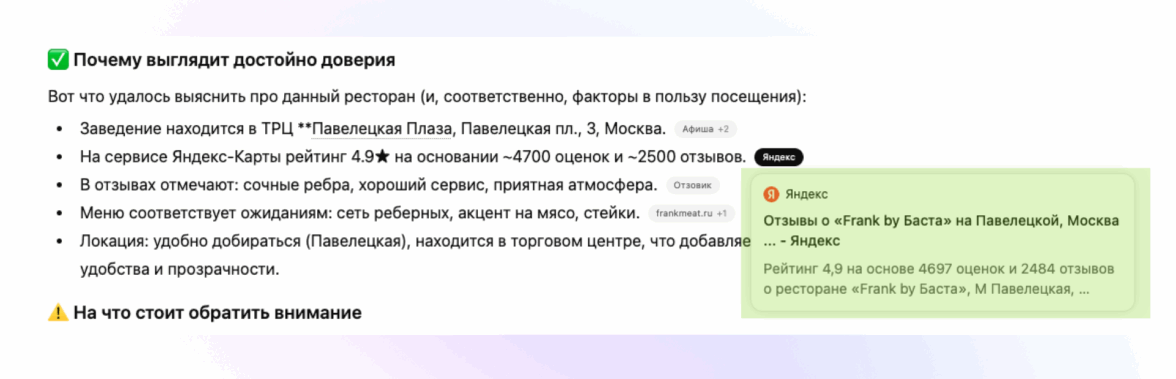 7. Искусственный интеллект. Сегодня Алиса, ChatGPT и другие умные помощники становятся настоящими рекомендателями. Они советуют, куда идти и каким брендам доверять. А источником для этих рекомендаций служат именно поисковая выдача и базы с отзывами. Поэтому работа с репутацией уже выходит за рамки маркетинга — она становится частью экосистемы искусственного интеллекта и GEO-продвижения.