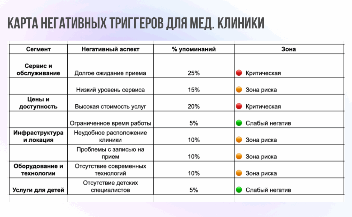Именно поэтому в рамках аудита репутации мы составляем «карту негативных триггеров» — наглядный отчет, который показывает, на что клиенты жалуются чаще всего и что нужно исправить в первую очередь.