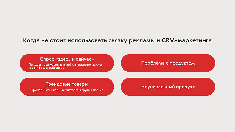 Есть ряд ситуаций, в которой связку рекламы и CRM-маркетинга использовать не стоит. В первую очередь это ниши со спросом «здесь и сейчас»: например, эвакуация автомобиля, вскрытие замков, горячий сезонный спрос, продажа трендовых товаров — спиннеры, антистресс-игрушки поп-ит и прочие. Пользователям нужен продукт здесь и сейчас, а значит длительная коммуникация с ними не имеет смысла.