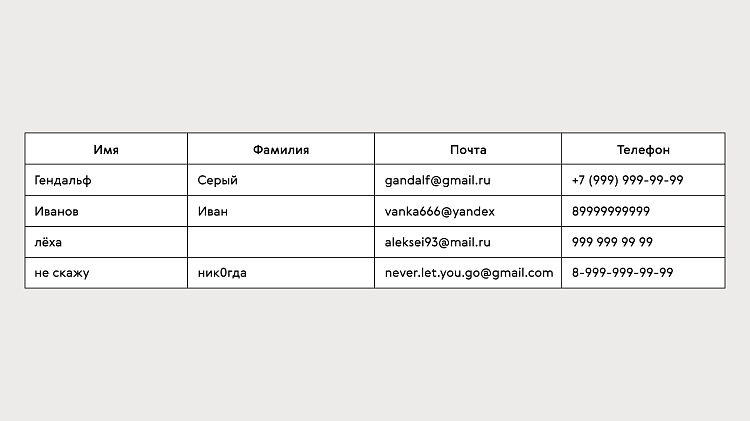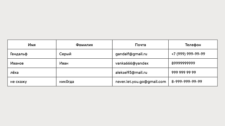На первый взгляд кажется, что только номера телефонов написаны по-разному. Но стоит присмотреться, и вы найдёте другие ошибки в данных