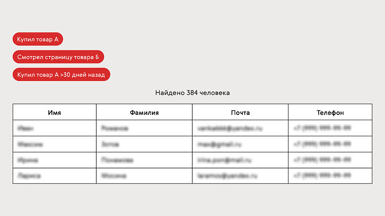 Другой возможный сценарий — исключить из рекламы нерелевантную аудиторию. Например, тех, кто уже купил товар, либо, наоборот, не выкупает его. Такие сегменты аудитории можно попробовать создать и в Яндекс Метрике, но они будут собраны на основе обезличенных данных, а значит будут менее точными. Сегменты из CRM на основе контактных данных — более надёжный способ исключить аудиторию из рекламы.