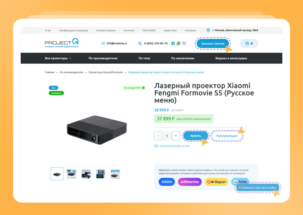 Пример хорошей карточки товара нашего клиента – интернет-магазина видеотехники. Пользователь не теряется в догадках, что делать: 4 понятных CTA на выбор: «Купить», «Консультация», «Заказать звонок» и онлайн-чат. Всё в зоне видимости. Искать ничего не нужно