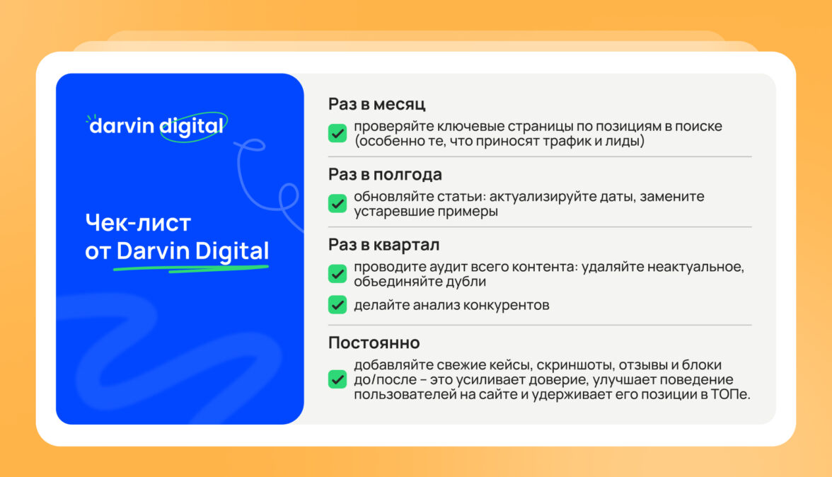 Алгоритмы и Яндекса, и Google видят, когда вы в последний раз редактировали статьи, добавляли что-то новое. Если ничего не происходит, они делают вывод, что бизнес либо не развивается, либо текст потерял ценность. И начинают занижать позиции в поисковой выдаче.