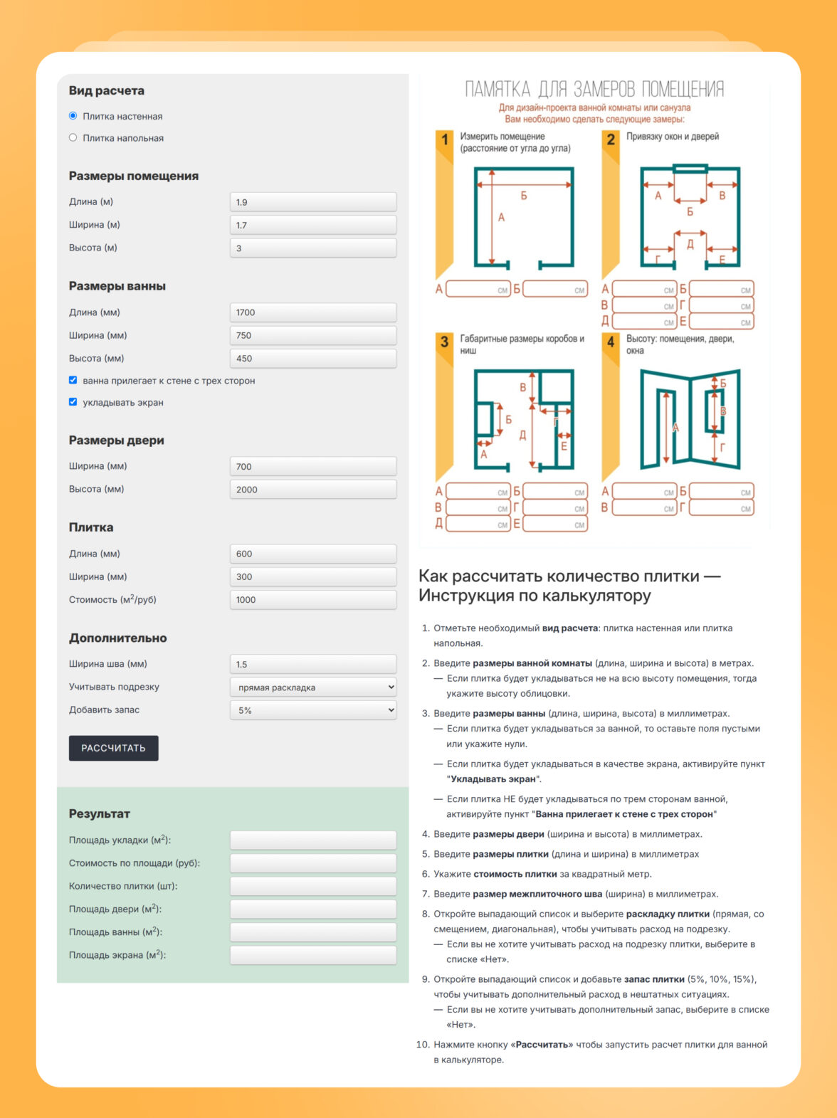 Если вы продаёте плитку, дайте расчёт, сколько нужно на санузел 2×1.8 метра.