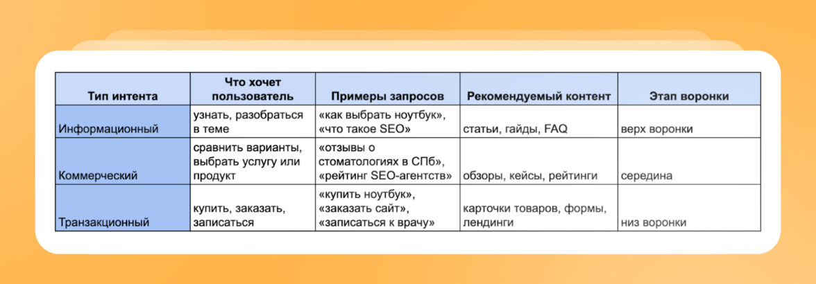 Использование типов намерений пользователей упрощает работу SEO-специалиста и контентщика: помогает строить контентную стратегию и поясняет, что, куда и зачем размещать