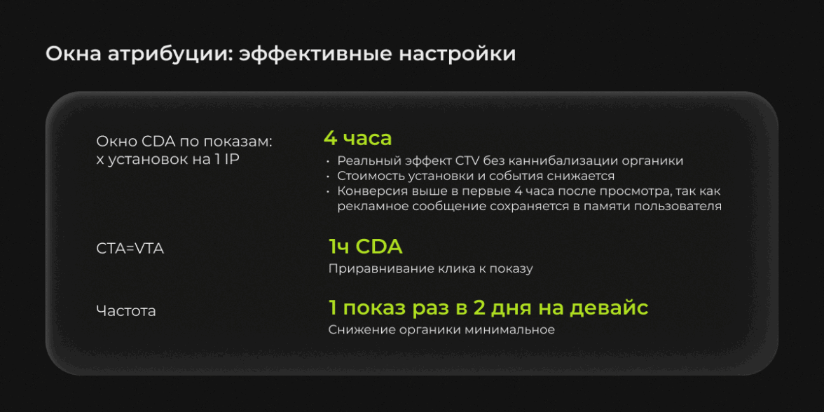 Если обнаружились негативные маркеры, нужно проанализировать CTV и другие источники — важен комплексный подход, потому что не всегда проблема в CTV. Больше всего внимания уделяем окнам атрибуции и частоте показов — эти параметры корректируем в первую очередь.