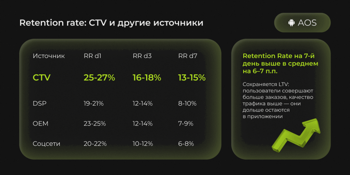 Важная особенность CTV — высокие показатели удержания (Retention rate). Это заметно в сравнении с DSP, OEM и соцсетями. Даже на 7-й день этот показатель выше, чем у других источников в сплите, на 5–7 п. п.