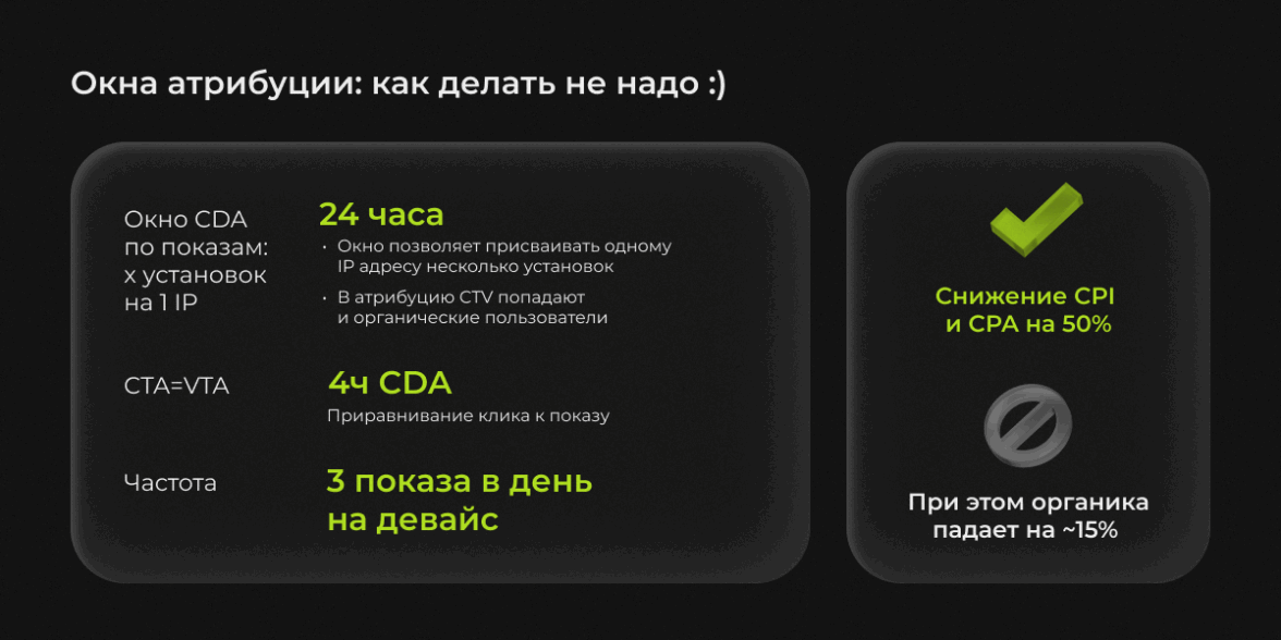 Некоторые настройки не стоит использовать, чтобы CTV не каннибализировал трафик у других источников, и в первую очередь органики. Приведем пример, при котором CPI и CPA снижаются на 50%, но и органика падает на 15%. То есть коммерческие показатели улучшаются за счет других источников трафика.