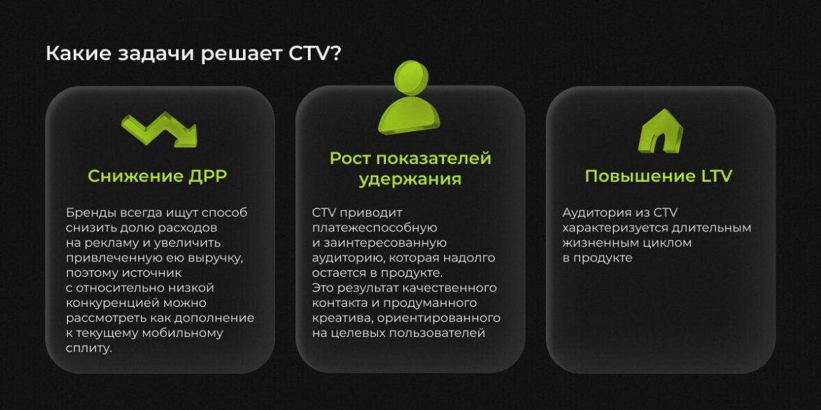 Connected TV (CTV) — полноценный перформанс-инструмент, который способен значительно повысить эффективность вашего медиасплита. Достаточно правильно его интегрировать, чтобы получить вовлеченных пользователей с отвечающей KPI юнит-экономикой, дополнить и усилить классические источники трафика.