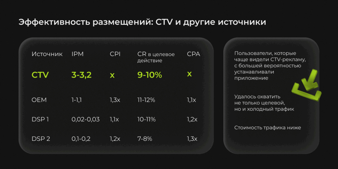 CTV демонстрирует лучшие показатели IPM, конверсии и удержания (Retention Rate) по сравнению со многими классическими каналами, обеспечивая низкий CPI и CPA.