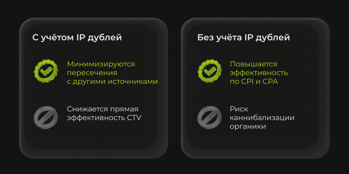 Чтобы настроить атрибуцию CTV максимально точно, важно учитывать данные по всему медиасплиту. При некорректных настройках источник может недополучать установки или «забирать» их у других из-за различий в моделях атрибуции. Поскольку с одного IP-адреса может происходить несколько установок, важно заранее определить подход к их учету — подробнее на баннере.