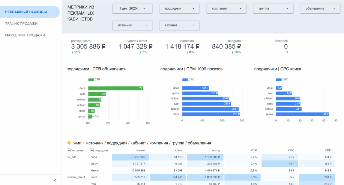 Данные находились в разных системах. Рекламные кабинеты жили своей жизнью, Яндекс.Метрика — своей, CRM — своей. Отчёты собирались вручную, комиссии подрядчиков учитывались отдельно, а реальную маржинальность приходилось «досчитывать в голове».