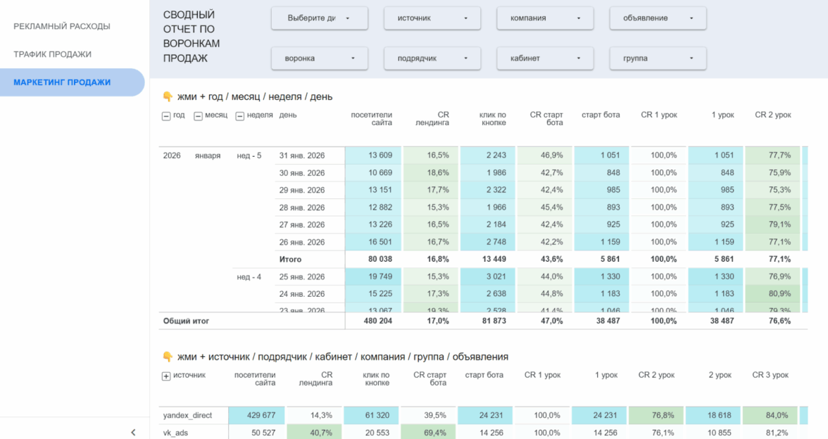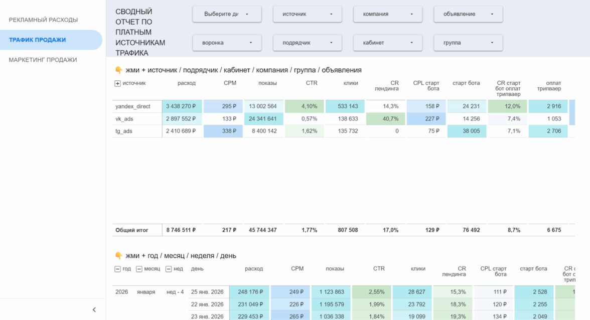 Отчёт гибко настраивается: можно фильтровать данные по нужным срезам и выводить только те показатели, которые важны для конкретной роли — собственника, маркетинга или отдела трафика.
