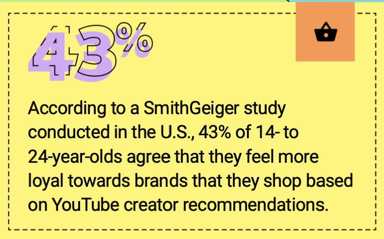 Согласно исследованию SmithGeiger, проведенному в США, 43% 14–24 летних согласны с тем, что они более лояльны к брендам, которые они покупают по рекомендациям авторов контента на YouTube.