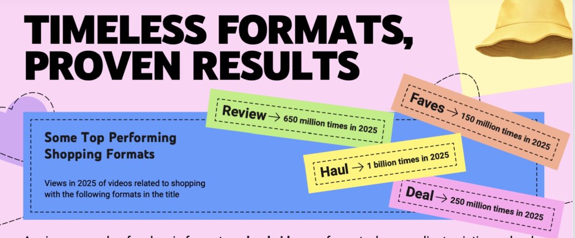 Вечные форматы, доказанные результаты. Для каждого формата указано число просмотров видео данного формата в 2025 году. Haul — рассказ о покупках, review — обзор, deal — спецпредложение, faves (сокращенное от favourites — фавориты, любимые продукты.