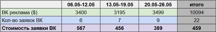 За 3 недели было получено 22 заявки с номером телефона по средней стоимости 459 руб.