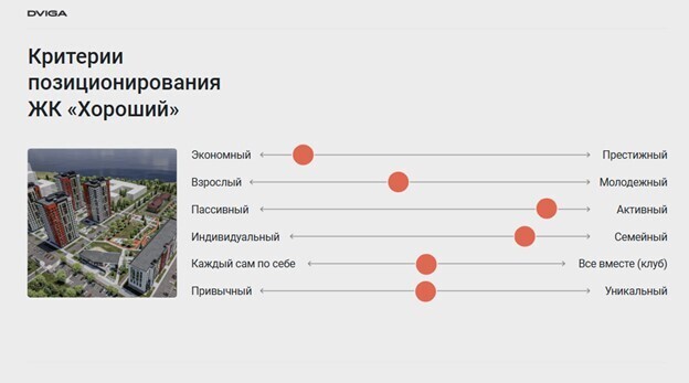 Мы проанализировали, как конкуренты взаимодействуют с аудиторией, на чем они делают акцент и какие у них рекламные посылы. Выяснили, что на рынке у всех «плюс-минус» одинаково, у большинства нет четкого позиционирования. Основными конкурентами являются ЖК «Солнечный город» и ЖК «Хороший».