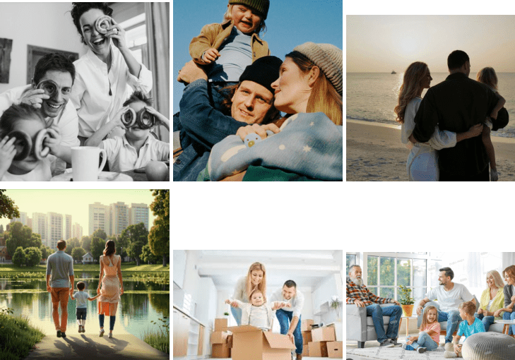 В каждом изображении мы показали один ключевой момент, который создаёт настроение: радостная сцена с ребёнком, играющим на площадке, вечер с пледом и фильмом, готовка на кухне с лёгким беспорядком, когда все заняты одним делом. Это образы, которые легко вызывают эмоции и ассоциируются с гармонией и спокойствием.