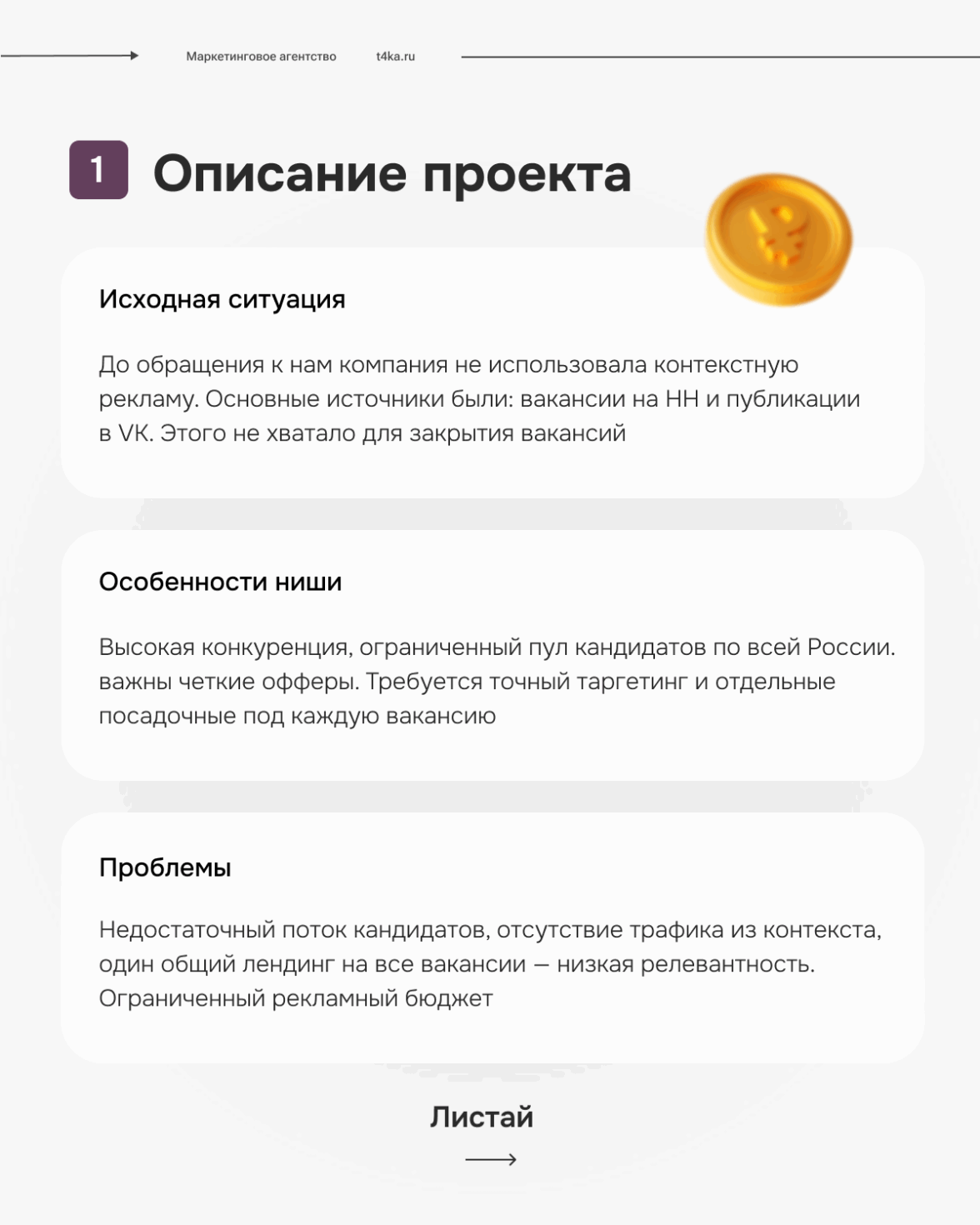 3. Проблемы. Недостаточный поток кандидатов, отсутствие трафика из контекста, один общий лендинг на все вакансии — низкая релевантность. Ограниченный рекламный бюджет
