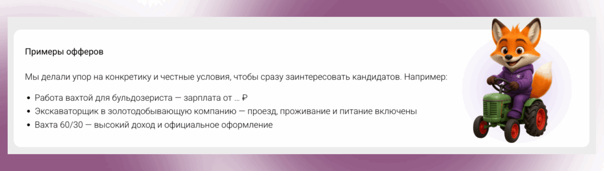 Мы доказали, что даже самые сложные вакансии можно закрыть быстро и недорого. Если вы устали от неэффективного рекрутинга и хотите получать поток целевых откликов всего за 81 ₽, пора действовать. Переходите на наш сайт, чтобы обсудить ваш проект и заказать эффективную HR-кампанию!