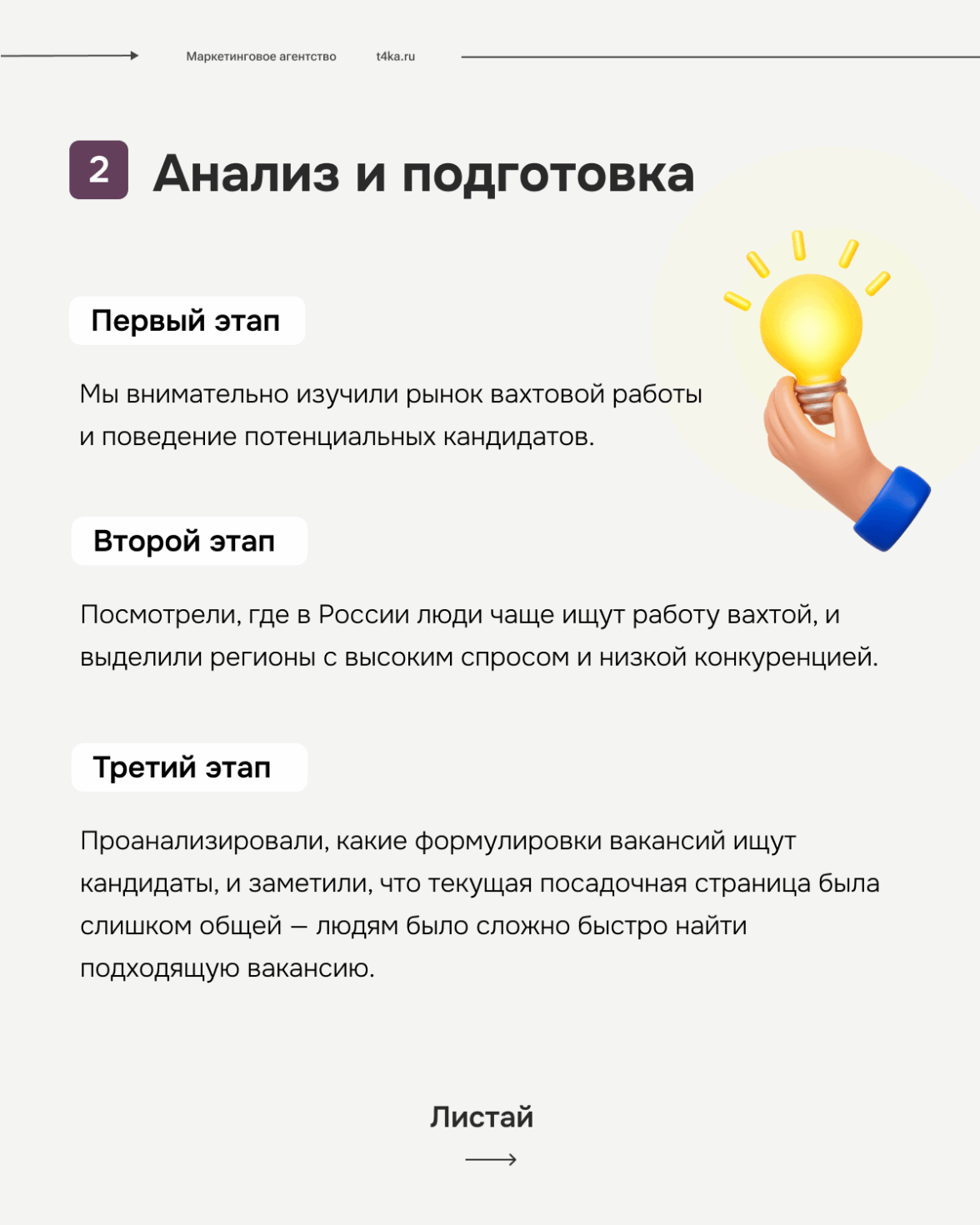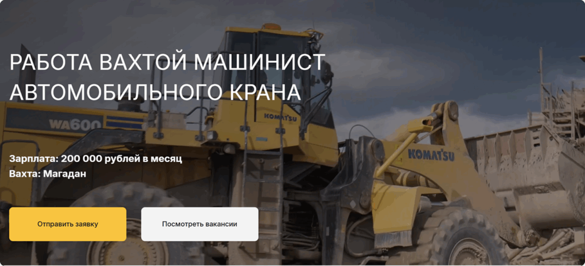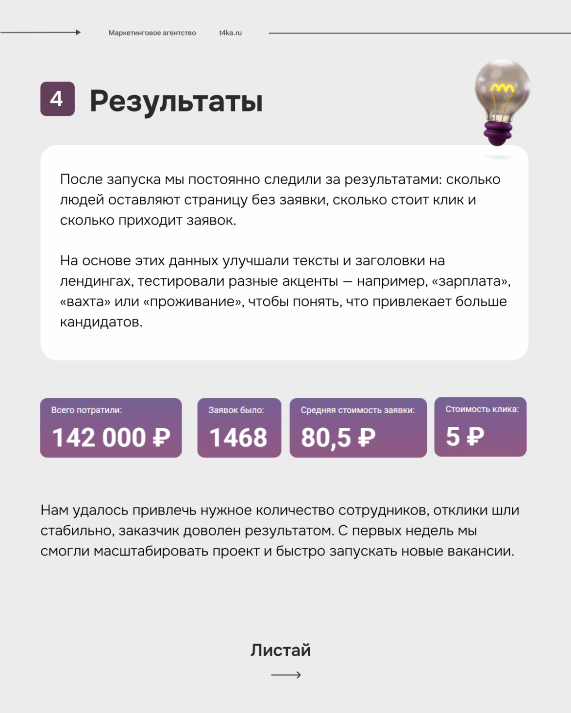 После запуска мы постоянно следили за результатами: сколько людей оставляют страницу без заявки, сколько стоит клик и сколько приходит заявок. На основе этих данных улучшали тексты и заголовки на лендингах, тестировали разные акценты — например, «зарплата», «вахта» или «проживание», чтобы понять, что привлекает больше кандидатов.