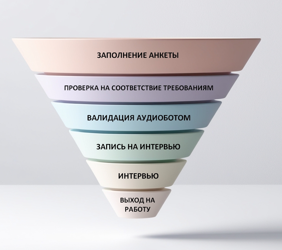 Интервью. Начиная с этого этапа продвижением кандидатов по воронке управляет сотрудник отдела кадров. Этапов интервью может быть несколько. Чаще всего это телефонное интервью, а потом личное собеседование.6. Выход на работу. После успешного прохождения всех этапов воронки кандидат получает предложение о работе и выходит на свое новое место в компании.