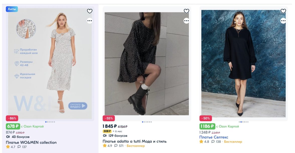 Карточки товаров в топе выдачи по запросу «платье» на OZON