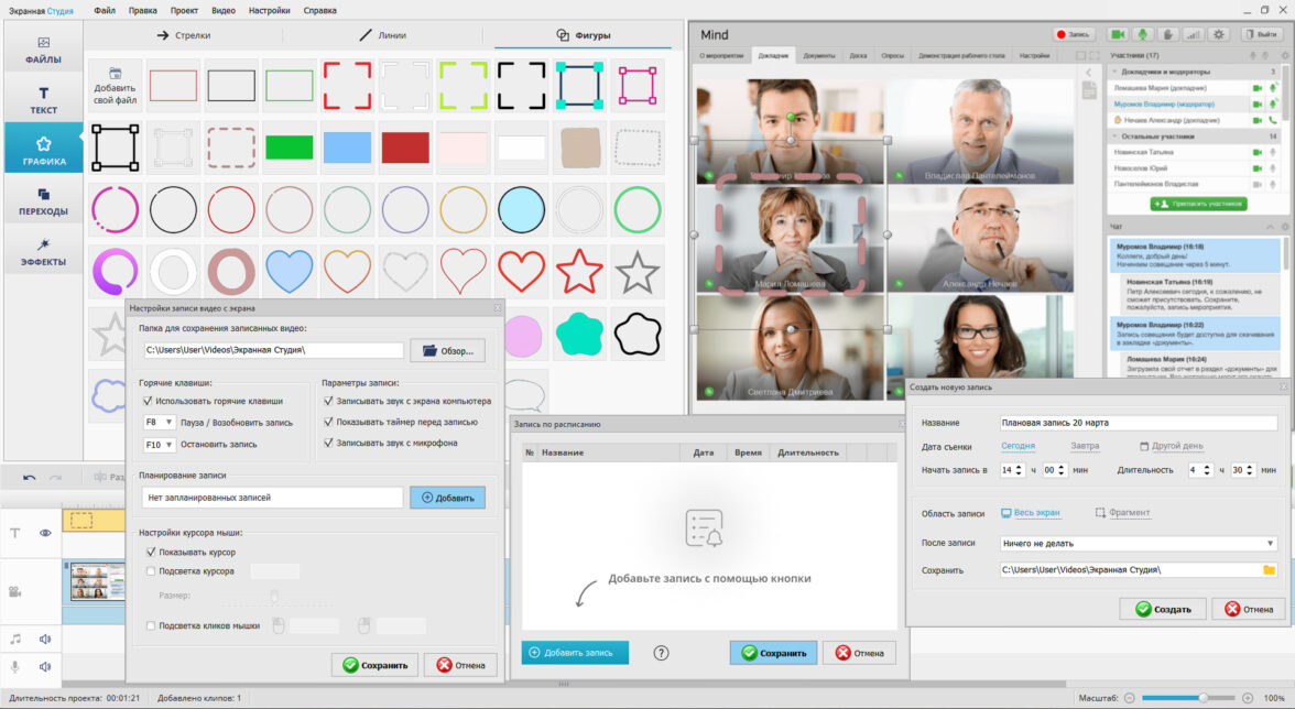 Экранная Студия идеально подойдет для съемки семинаров, рабочих встреч и обучающих материалов. Программа гарантирует высокое качество записи одновременно с монитора и веб-камеры. Захватывайте любую часть экрана для акцентирования внимания слушателей. Нарезайте материал на клипы, удаляйте ненужное — перерывы или долгое вступление. Подписывайте ключевые места титрами для облегчения восприятия информации. Пользуйтесь заставками, чтобы разделить видео на блоки.