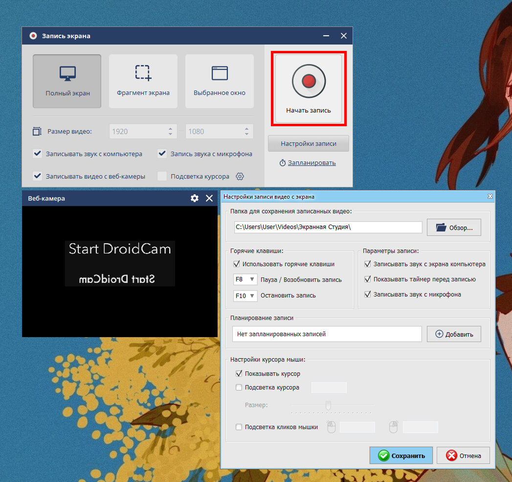 Настройте параметры записи — выберите режим захвата экрана. Укажите источник звука (микрофон, наушники или динамики), а также веб-камеру.