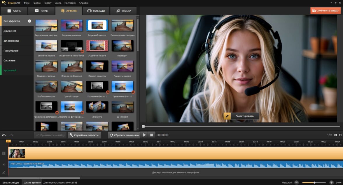 Редактор с удобным интерфейсом подойдет и новичкам, и продвинутым пользователям. Вы сможете вырезать лишние фрагменты, склеивать ролики, менять скорость, накладывать на изображение видео или картинку. Программа оснащена коллекцией 100+ стильных переходов и свыше 70 спецэффектов. Предусмотрена возможность анимации любых элементов в кадре. А с помощью встроенного хромакея вы легко замените фон.