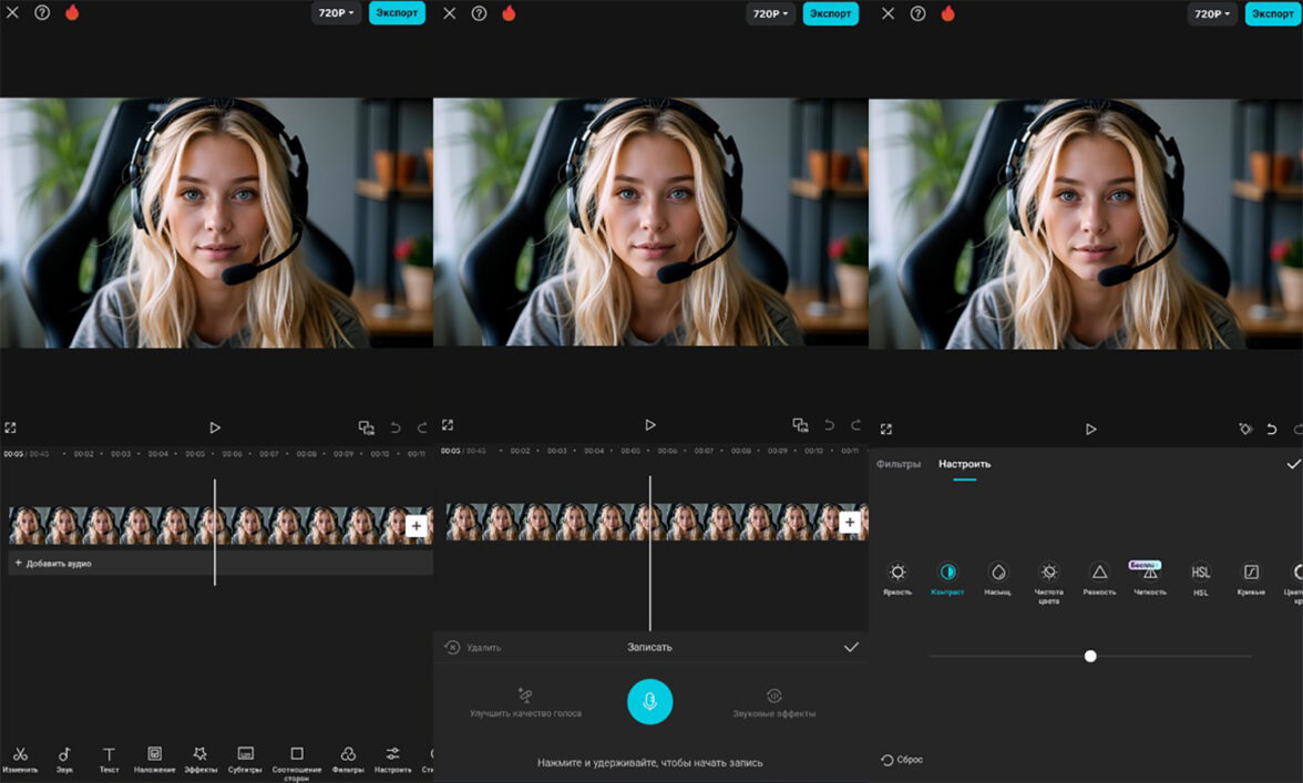 Те, кто снимал подкаст на камеру смартфона, могут смонтировать ролик с помощью мобильного редактора. Хотя CapCut в основном предназначен для монтажа вертикальных клипов, в нем также можно работать и с горизонтальными видео. Редактор позволяет настроить яркость и контрастность, вырезать неудавшиеся моменты или склеить несколько фрагментов, добавить анимированные переходы. Мобильное приложение также позволяет работать с аудиорядом — извлекать и накладывать звук, регулировать громкость.
