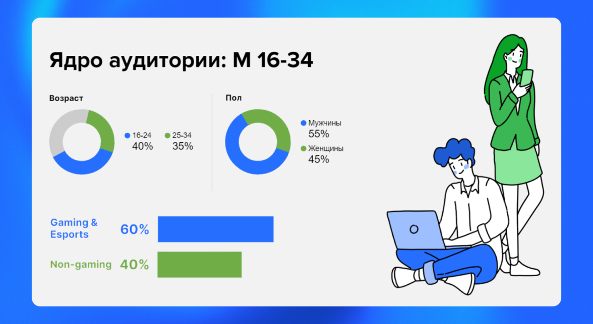 Более 300 000 инфлюенсеров и студий создают live- контент для 15 000 000 уникальных вовлеченных пользователей в различных категориях, таких как: игры, музыка, фильмы, кулинария, киберспорт, общение и многое другое. Ядро аудитории — от 16 до 34 лет.