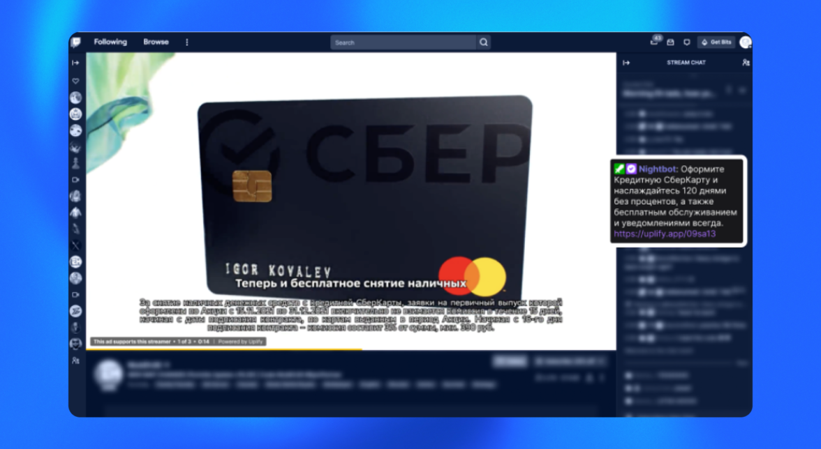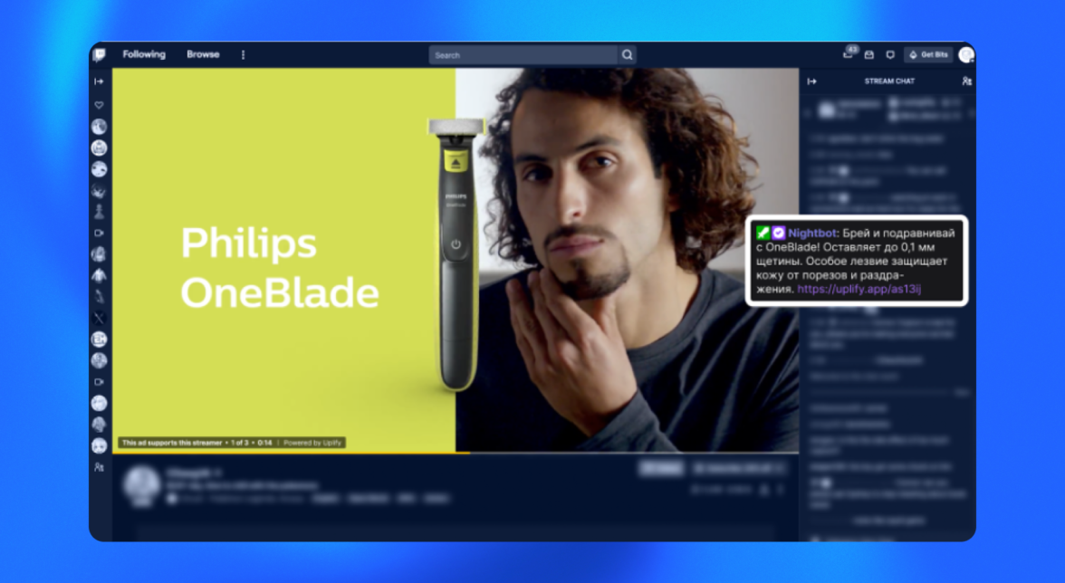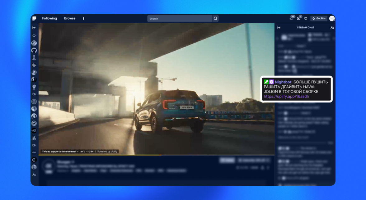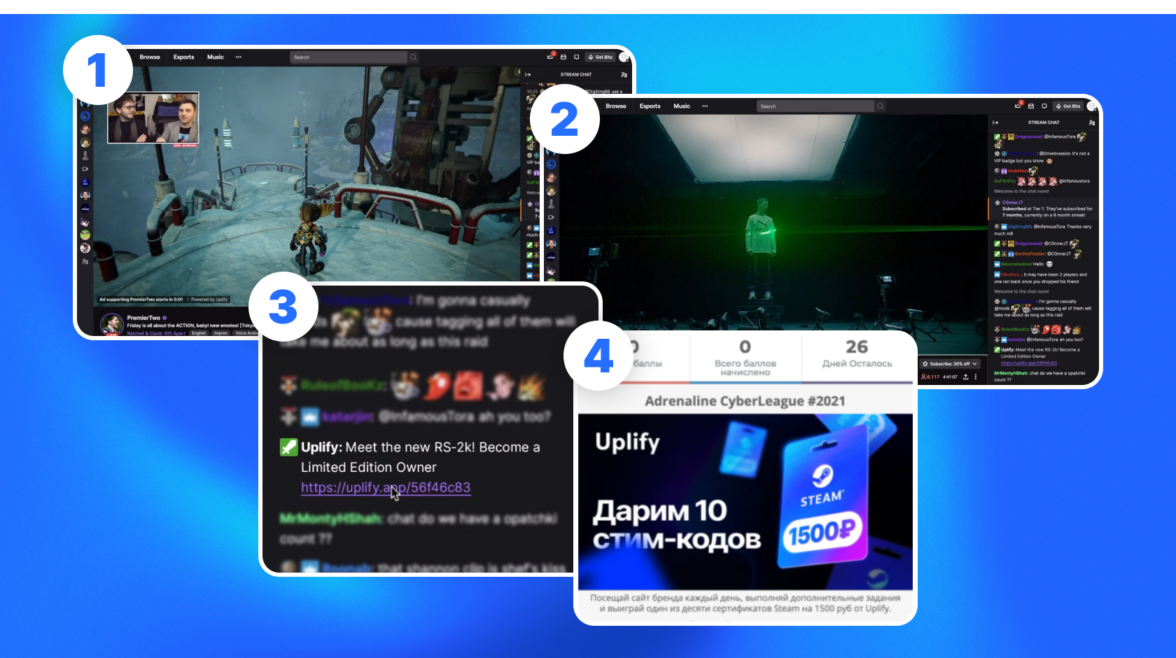 Всем привет! На связи сервис Uplify. Uplify — это первый сервис, который позволяет охватить аудиторию разных лайвстрим платформ: Twitch, YouTube Live, Trovo, VK, Telegram. Он автоматически встраивает рекламные креативы брендов в трансляции стримеров.