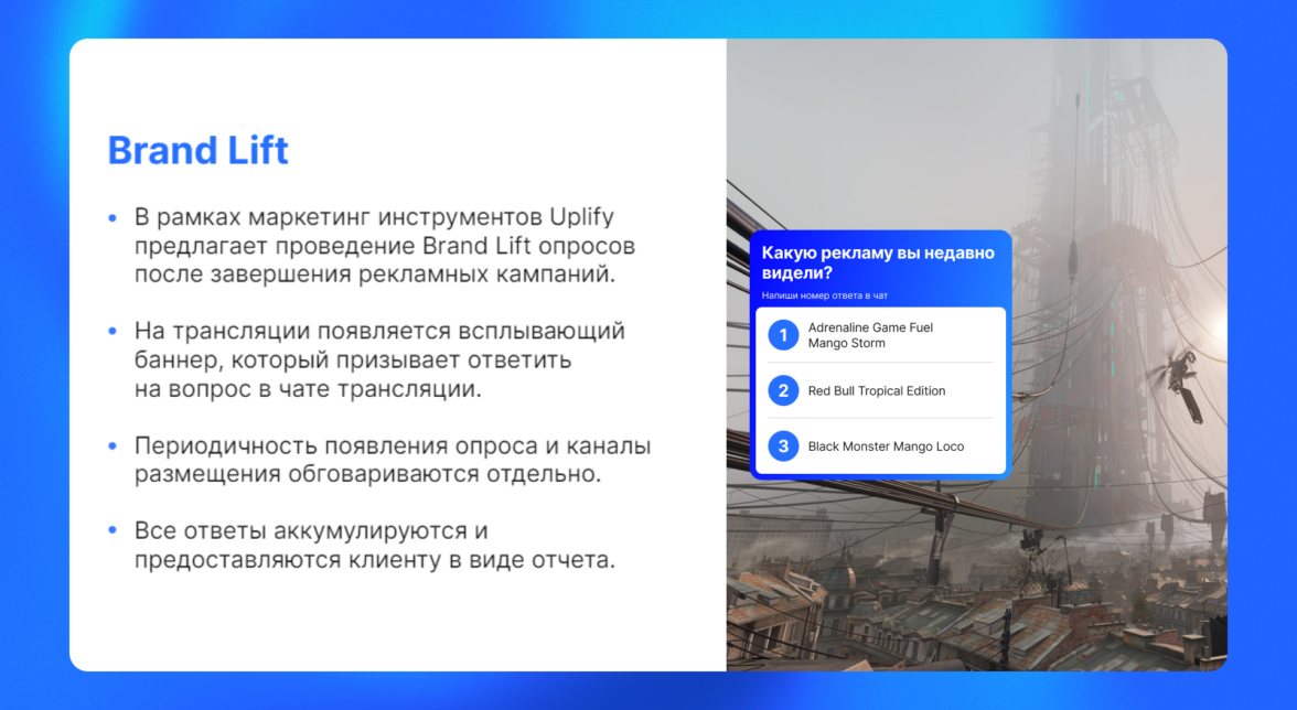 После завершения партнерских интеграций Uplify предлагает проведение Brand Lift-опросов. Этот инструмент помогает рекламодателю понять запоминаемость своего продукта, потенциальную возможность покупки.