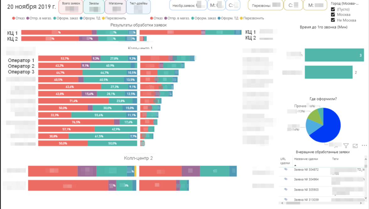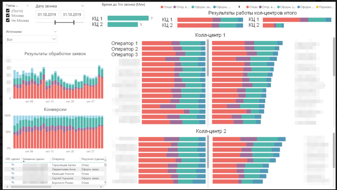 Кейс интернет-магазина. Мы сделали отдельный отчет для супервайзера колл-центров. Теперь у него под рукой всегда находятся результаты конкретных операторов и КЦ в общем: конверсии, время перезвона, список сделок, обработанных операторами, со ссылками в amoCRM.