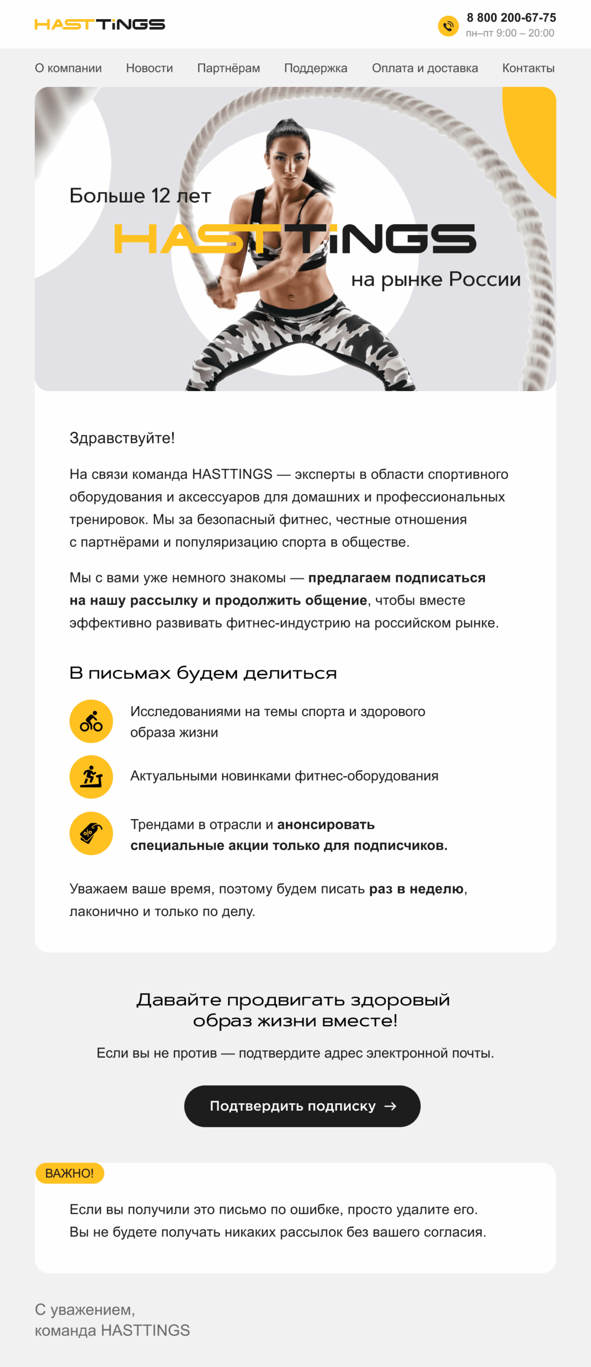 HASTTINGS детально рассказывают о себе и рассылке, аргументируют, почему стоит подписаться. А яркий динамичный дизайн привлекает внимание.