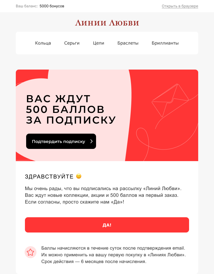 Для запуска емейл-коммуникации нужно получить согласие на рекламные сообщения. Для этого отправляем письмо с просьбой подтвердить подписку — DOI. Оно относится к транзакционным, поэтому такая рассылка не противоречит закону (момент проявился!).