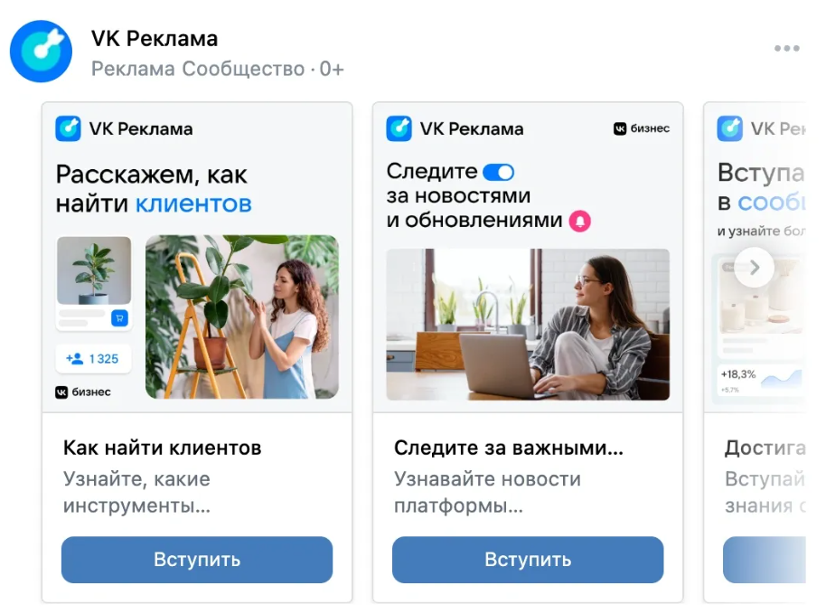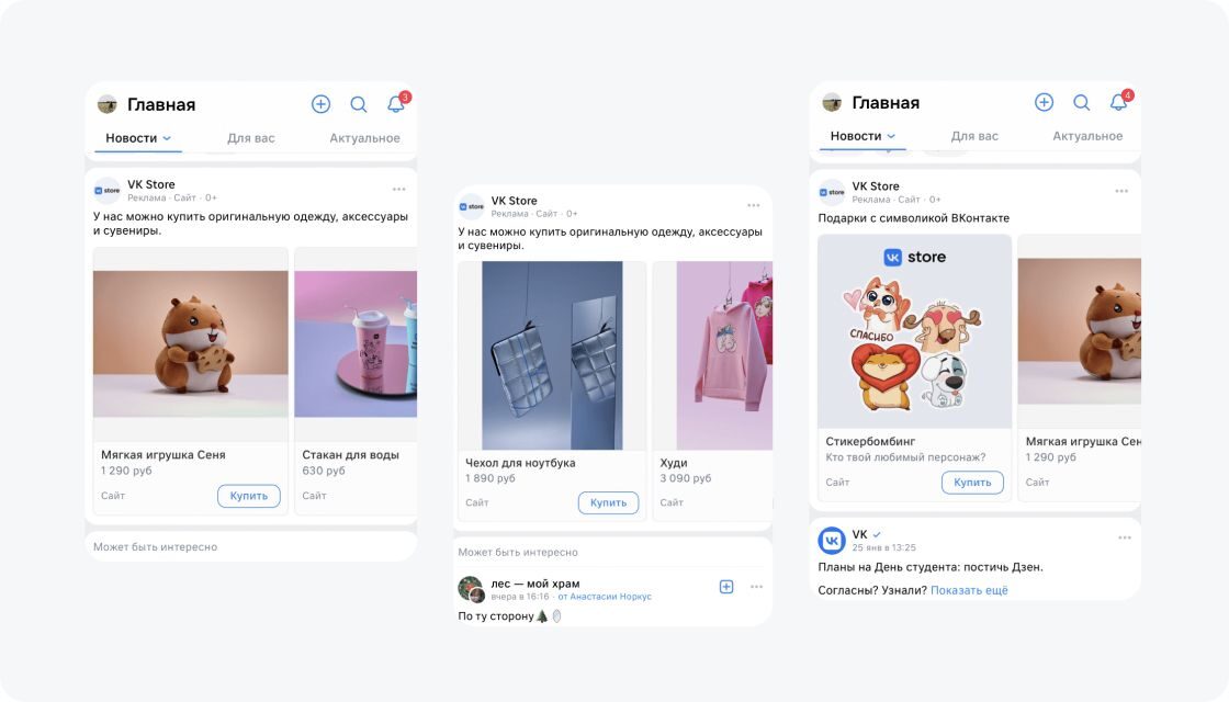 Карусель включает несколько слайдов с товарами в одном рекламном блоке. Реклама показывается не только во «ВКонтакте», но и в «Одноклассниках», на принадлежащих VK площадках, а также площадках, которые входят в рекламную сеть VK.