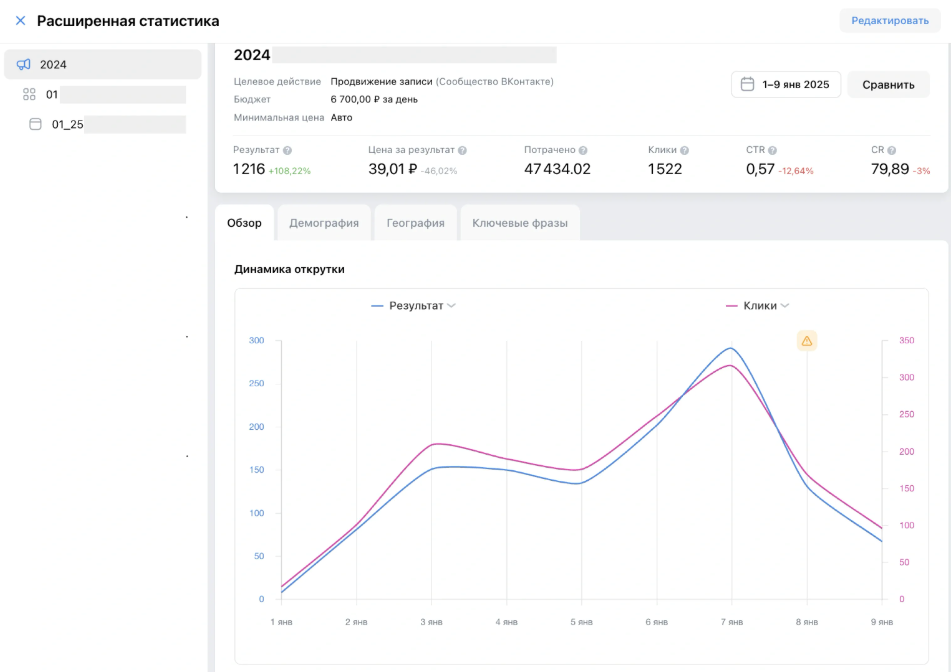 Первый шаг — анализ данных на площадке. Анализируем статистику в разделе «Расширенная статистика»: демографию, географию, и также ключевые запросы.