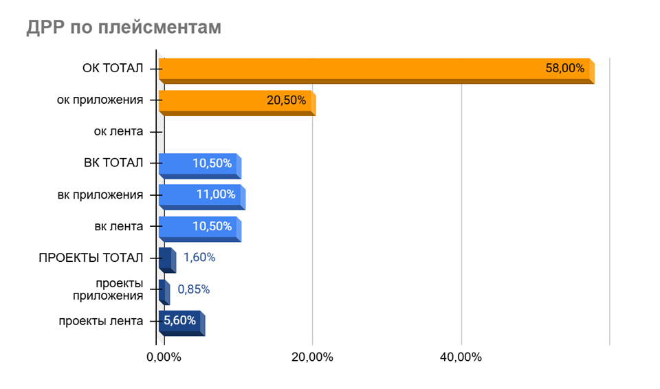 Тесты плейсментов для сегмента FMCG в ecommerce показали, что проекты VK приносят покупки с ДРР в 2 раза ниже, чем лента и приложения VK. По сравнению с приложениями «Одноклассников» ДРР получился ниже в 4 раза. Эффективность каждого плейсмента лучше определять благодаря сегментации в рамках продвижения каждого бренда, поскольку результативность может отличаться.