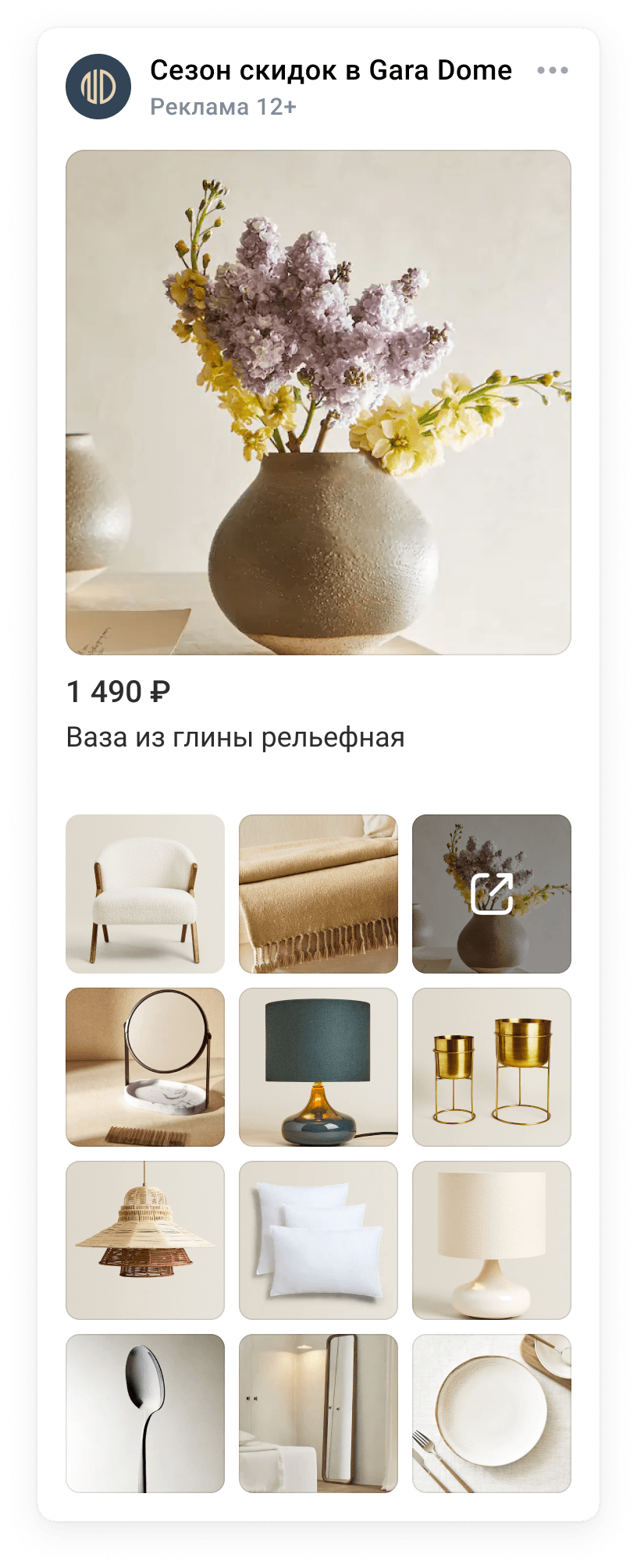 Такие баннеры могут размещаться во всех возможных рекламных блоках на всех площадках проектов VK Ads. В зависимости от места размещения в объявлении может быть от 2 до 12 товарных карточек.