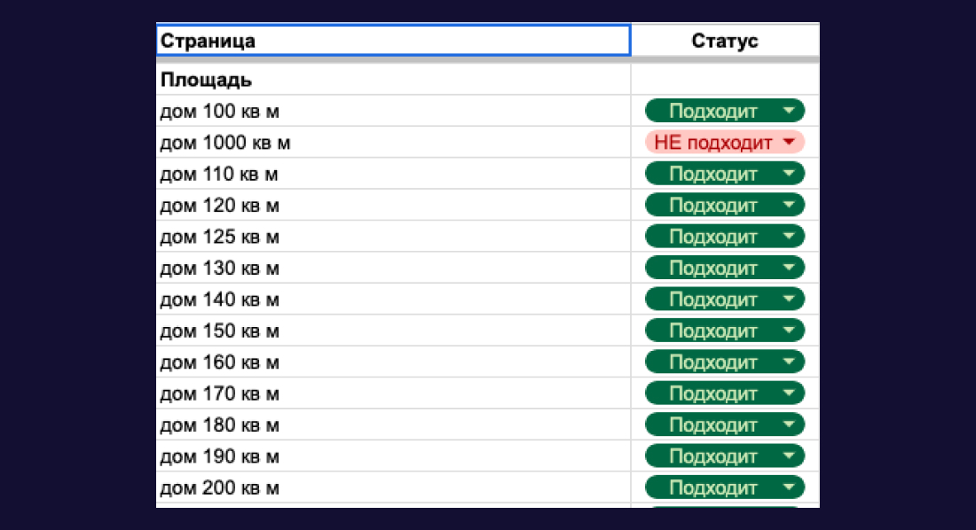 Плюс комбинации описанного выше со спросом. Например, одноэтажные дома из газобетона.Отдельно можно выделить запросы со словомпроекты. Часть пользователей по этому запросу интересует исключительно покупка проектов для строительства, но части интересна и покупка проекта и строительство домов. Мы продвигались по тем запросам с упоминаниемпроектов, где люди интересуются и строительством.Исключили коммерческие запросы по проектам, под которые клиент не строит дома. Например, дома 6 на 6 из газобетона.