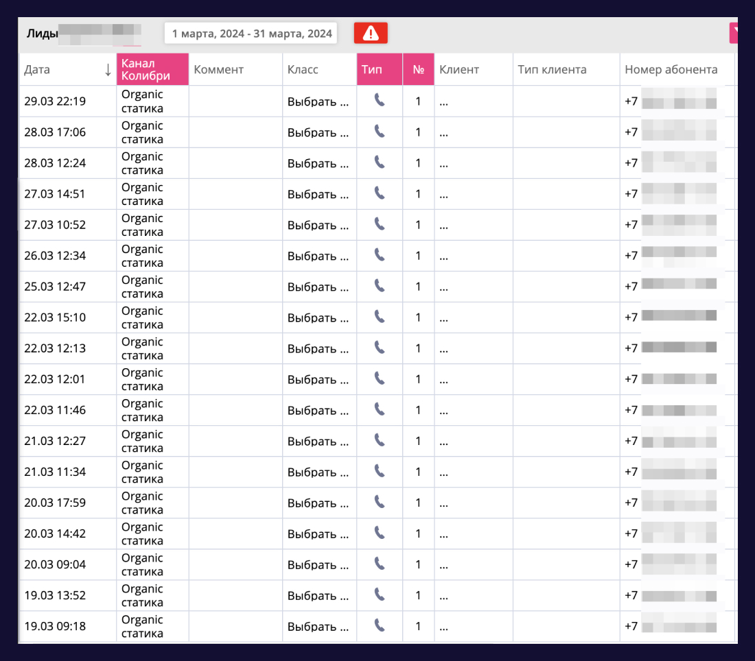 Фрагмент Единого Журнала Лидов Callibri, где видно звонки пользователей, которых привела органика.