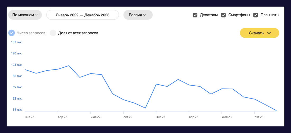 Поэтому мы работали над улучшением текущих позиций и появлением сайта в топе выдачи с помощью релевантных запросов. Конверсию в заявку также помогли удержать внешние факторы: