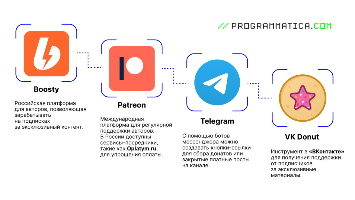 Подписки становятся популярнее в России. Платформы вроде VK Видео и Telegram позволяют предлагать закрытый контент за плату. В июле 2022 года в «Сравни-ру», проанализировали около 10 000 авторов Boosty на основе неофициальных данных. Примерно 10% блогеров зарабатывают от 10 000 ₽ в месяц, 89 авторов получают более 100 000 ₽ в месяц с подписок, а авторы из топ-50 зарабатывают от 150 000 ₽ в месяц. Наверняка эти цифры возросли, так как Boosty стал привычным и известным всем сервисом.
