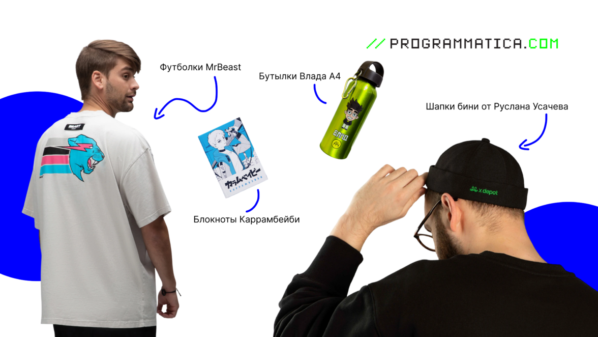 Мерч — футболки, кружки, аксессуары — работает для блогеров с лояльной аудиторией.