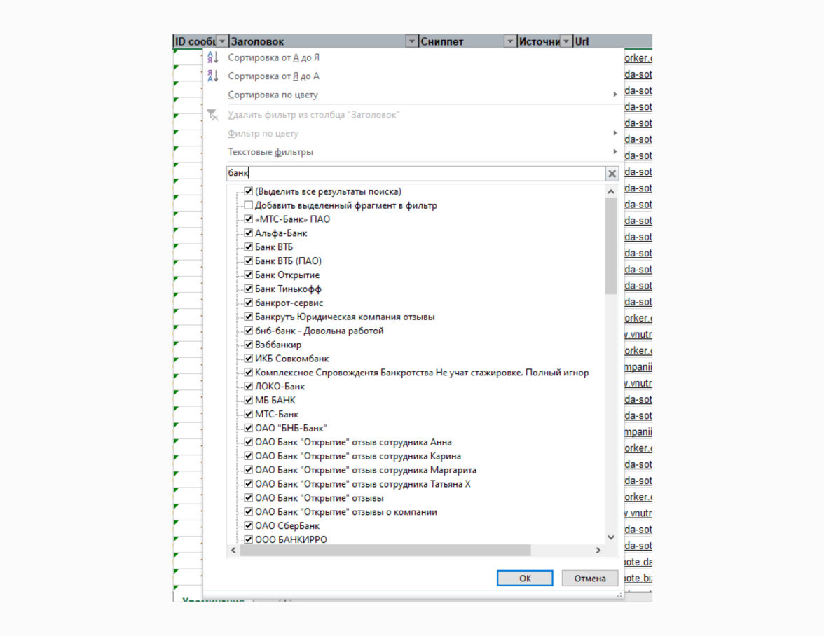 Выгрузили сводный отчёт и уже вручную стали проставлять сектора бизнеса. Сначала фильтровали сниппеты по тем словам, которые характеризуют бизнес. Например:
